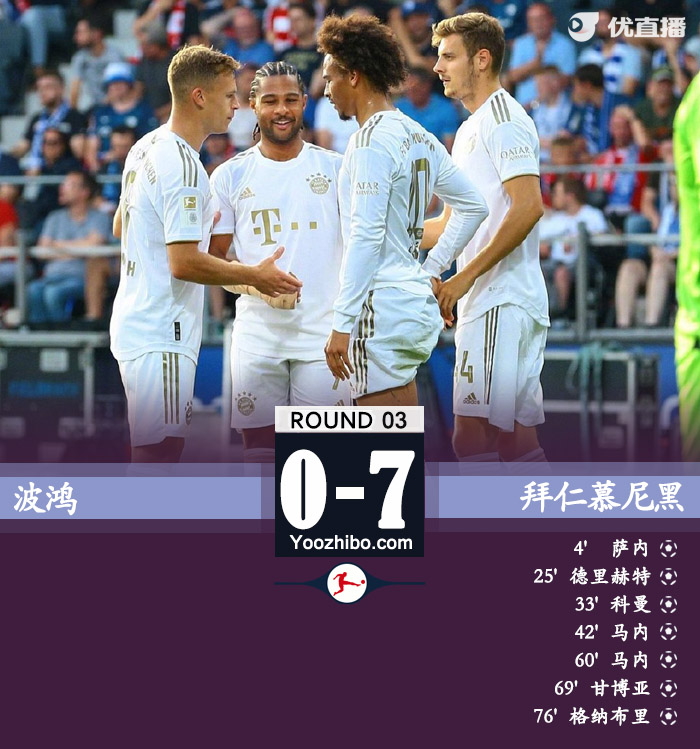 24直播网讯:北京时间8月21日23:30,德甲第3轮展开较量,波鸿主场对阵拜仁。上半场刚开场科曼将球回做,萨内劲射破门,之后德利赫特头球破门,随后波鸿后卫出现失误,科曼门前补射将球打进,马内破门被吹手球,一分钟后马内杀入禁区晃过后卫左脚低射破门。下半场科曼造点,马内点射破门,随后甘博亚自摆乌龙,之后格纳布里小角度打门,皮球击中立柱弹入球网。全场结束,波鸿0-7不敌拜仁。