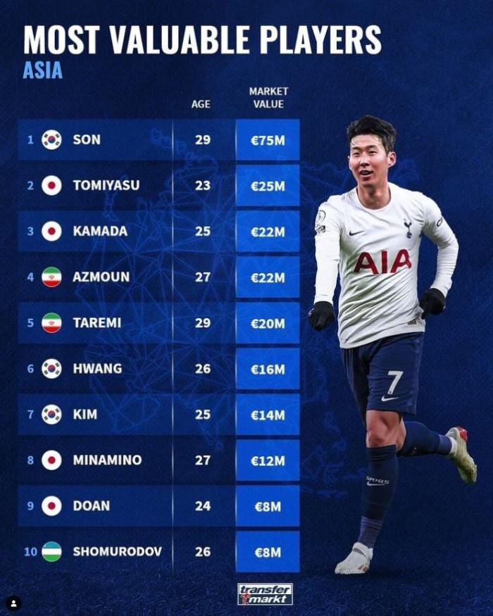 24直播网06月27日讯 德国转会市场今天盘点了亚洲球员身价排名,孙兴慜7500万欧元排在第一位,前十里面有4名日本球员和3名韩国球员。
