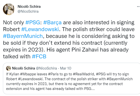 莱万和拜仁的合同到明年夏天,双方还没有达成续约,他的经纪人扎哈维已经联系了巴黎。如果姆巴佩今夏加盟皇马,巴黎将尝试签下莱万。