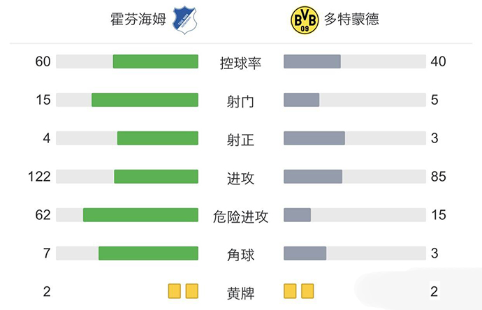 全场比赛结束,多特3-2击败霍芬海姆。