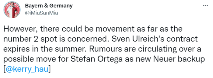 但是,拜仁在二门上可能会有变动。乌尔赖希的合同将在今夏到期,拜仁可能会签下比勒费尔德门将奥特加作为诺伊尔的替补。