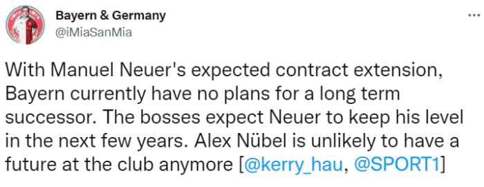 24直播网01月22日讯据德国媒体sport1记者KerryHau,拜仁对诺伊尔接班人这件事上暂时没有长远考虑,因此努贝尔在球队已经失去未来。