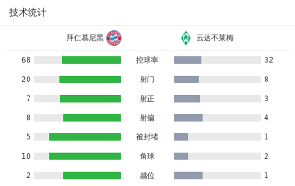 拜仁0-1不莱梅 少赛一轮距榜首药厂7分