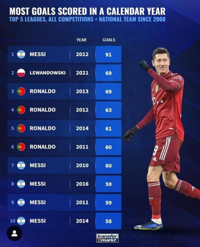 24直播网12月20日讯 消息,德国转会市场统计了2000年以来的五大联赛自然年进球纪录(所有俱乐部赛事和国家队比赛),梅西以91球居首。