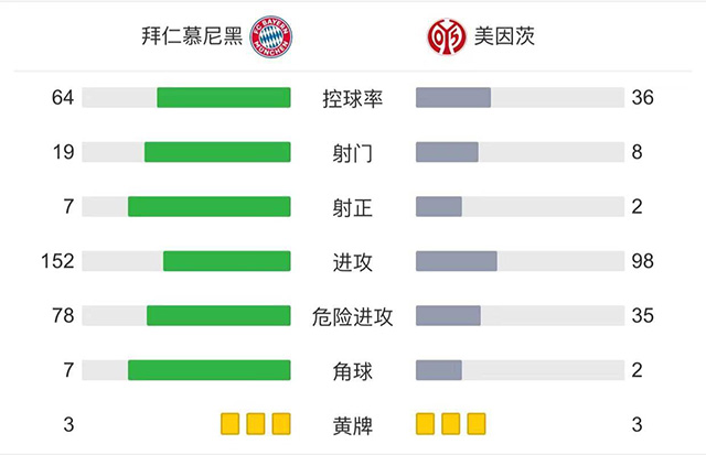 第21分钟,拜仁后场出球失误,美因茨前场左路断球后在禁区内传中,奥尼西沃禁区内头球破门,美因茨1-0拜仁慕尼黑。