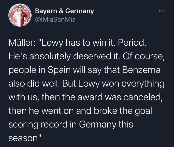 “莱万必须要赢,他绝对配得上金球奖。当然一些在西班牙的人们会说本泽马也做的很好,但是莱万和我们赢得了所有荣誉,然后去年的颁奖取消了。今年他又继续表现出色,打破了德甲进球纪录。”