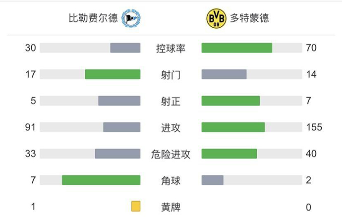 全场比赛结束,多特蒙德客场3-1战胜比勒菲尔德。