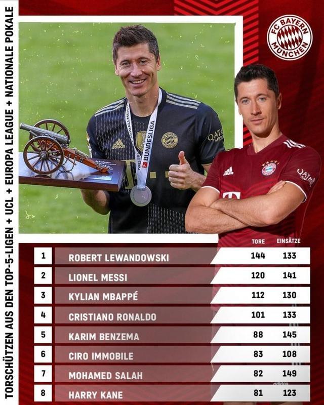 24直播网讯8月22日消息,拜仁官网统计了2018年8月以来五大联赛各项赛事总射手榜,133场打进144球的莱万多夫斯基力压梅西位居榜首。