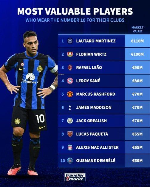 24直播网12月30日讯 德转10号球员最新身价排行榜,劳塔罗以1.1亿欧成为现役身价最高,维尔茨和莱奥分列第二第三。