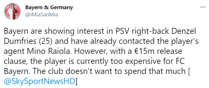 德天空表示,拜仁对邓弗里斯很感兴趣,并且已经联系了球员的经纪人拉伊奥拉。但是邓弗里斯有1500万欧元的解约金条款,拜仁认为这太贵了,俱乐部不想花那么多钱。