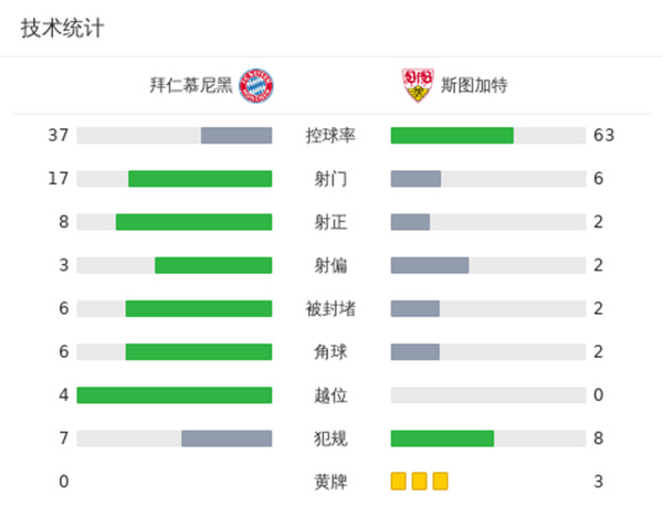 关键事件: 第2分钟,拜仁闪击得手!萨内前场接长传球过掉出击的努贝尔后横传凯恩门前推射得手,拜仁1-0斯图加特。