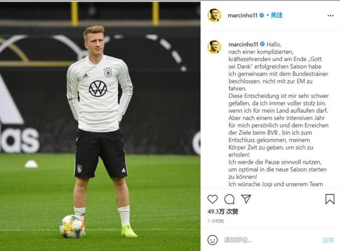24直播网讯 北京时间5月19日,罗伊斯在个人社交媒体上宣布,自己不会参加今年夏天的欧洲杯。