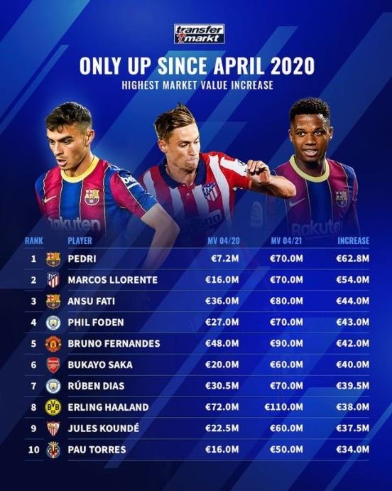 24直播网5月2日讯 近日,德转列出了从2020年4月至2021年4月这一年间球员身价涨幅榜单,佩德里排名榜首,B费、法蒂、哈兰德在列。
