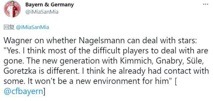 在谈到纳格尔斯曼能否很好的与拜仁队内的球星相处时,瓦格纳说:“是的,我认为大部分相处困难的人都已经走了。现在的球星比如基米希、格纳布里、聚勒、戈雷茨卡与之前的人不同。我认为纳格尔斯曼已经接触了一些拜仁球员,这对他来说不是一个完全陌生的环境。”