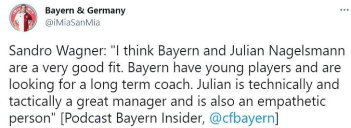 瓦格纳说:“我认为拜仁和纳格尔斯曼非常合适,拜仁拥有很多年轻的球员而且在找一位长期执教的教练。纳格尔斯曼在技战术上非常出色,同时也是一位善解人意的教练。”