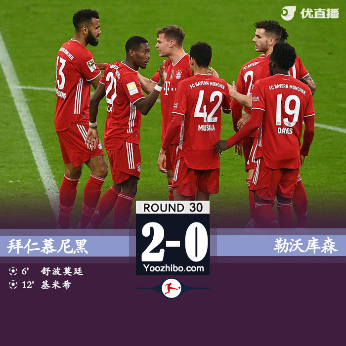 拜仁慕尼黑2-0勒沃库森 舒波-莫廷破门基米希建功
