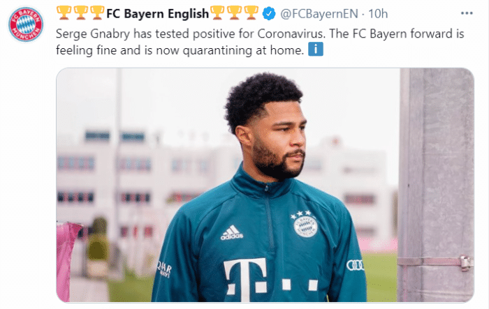 拜仁声明写道:“俱乐部确认格纳布里新冠检测呈阳性,目前他状况良好,正在居家隔离。我们将继续关注球员的状况,希望格纳布里早日康复,”