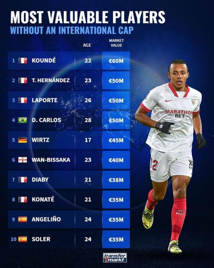 1、孔德(塞维利亚,法国,后卫):6000万欧元