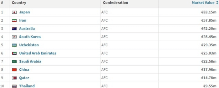 24直播网4月1日讯 德国转会市场网日前统计了亚洲各国家队本期大名单的身价,其中日本以8315万欧元排名第一,韩国因为孙兴慜没有入选而排名第四,中国则排名第八。