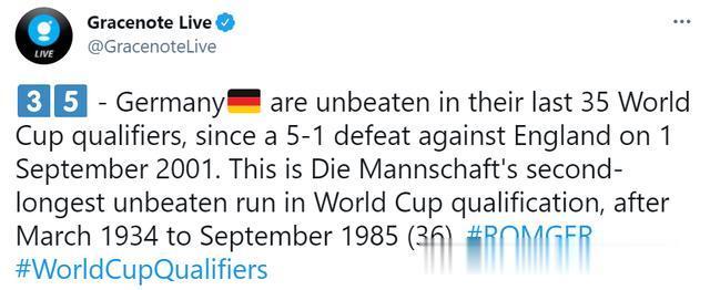 据统计,这是德国队史第二长的世预赛连续不败纪录,仅次于1934年3月至1985年9月间的连续36场不败纪录。