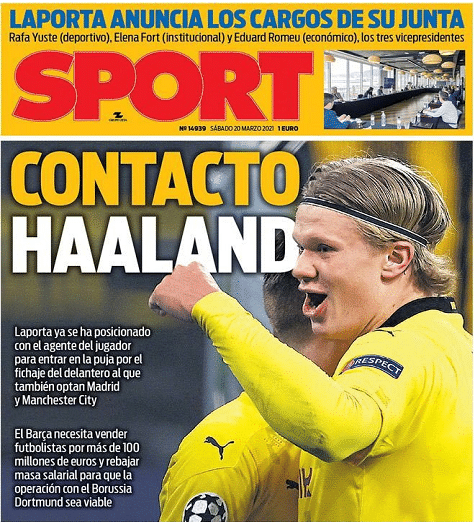 近日,《每日体育报》头版头条报道,拉波尔塔已经亲自致电联系了拉伊奥拉,他询问了哈兰德的事情,表达了希望签下哈兰德的意愿。而巴萨后面会清洗部分球员,全力追求哈兰德。当然,虽然目前追求哈兰德的球队比较多,但是拉波尔塔依然有信心签下哈兰德,因为他相信巴萨的影响力和与梅西搭档的吸引力,同时拉波尔塔和拉伊奥拉的私交非常好。