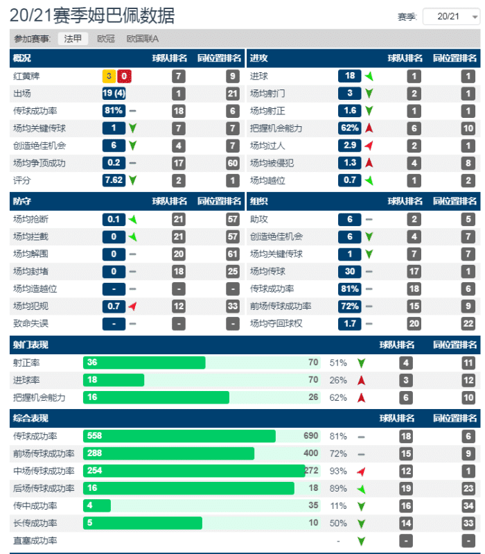 考虑到哈兰德上赛季效力过两支球队,具体对比一下两人本赛季的数据。在联赛赛场上,姆巴佩出场19次,打进18球助攻6次,球员场均射门3次,场均射正1.6次,把握机会能力62%,场均过人2.9次,场均关键传球1次。而且姆巴佩的传球成功率很高,他的前场传球成功率高达72%,中场传球成功率高达93%。长传成功率也高达50%。这是一个中场球员应有的数据。