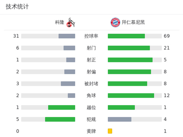 全场比赛结束,下半场补时3分钟,科隆0-1拜仁。