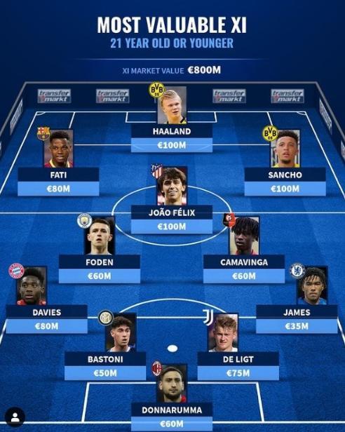 24直播网1月11日讯 北京1月11日,《德国转会市场》最新统计出21岁以下球员最贵阵容,其中哈兰德、桑乔、菲利克斯三人身价都在1亿欧。