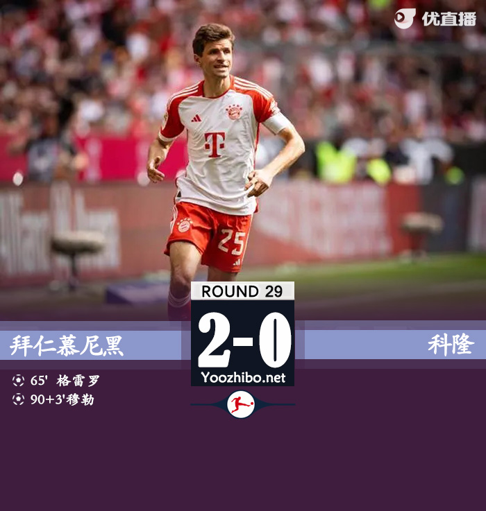 第90+3分钟,科隆后防线停球失误被穆勒断下,穆勒单刀突入禁区冷静推射破门!拜仁2-0科隆