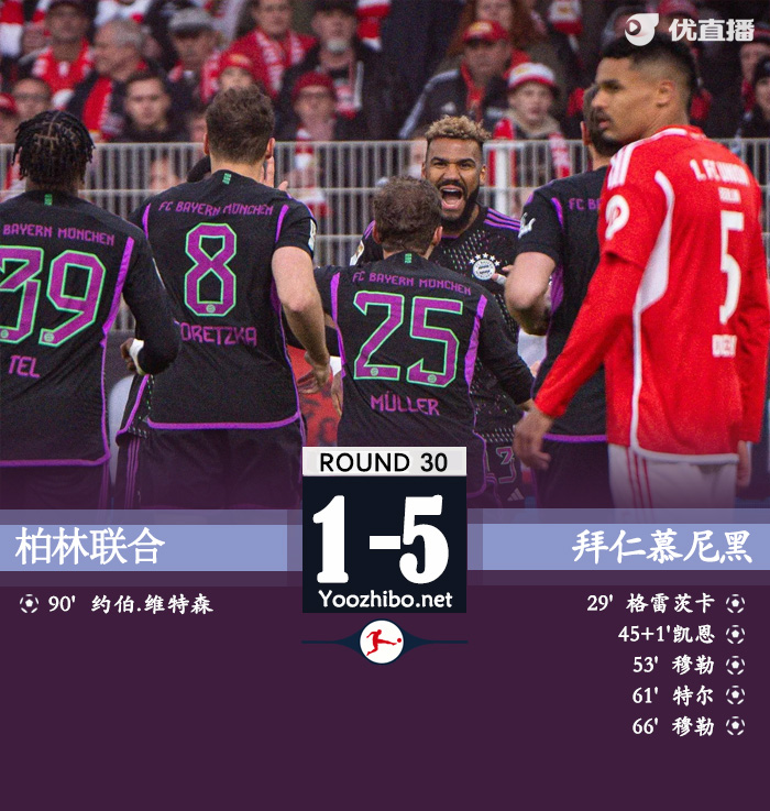 第66分钟,格雷茨卡送出传中,禁区内穆勒甩头攻门得手,拜仁5-0柏林联合。