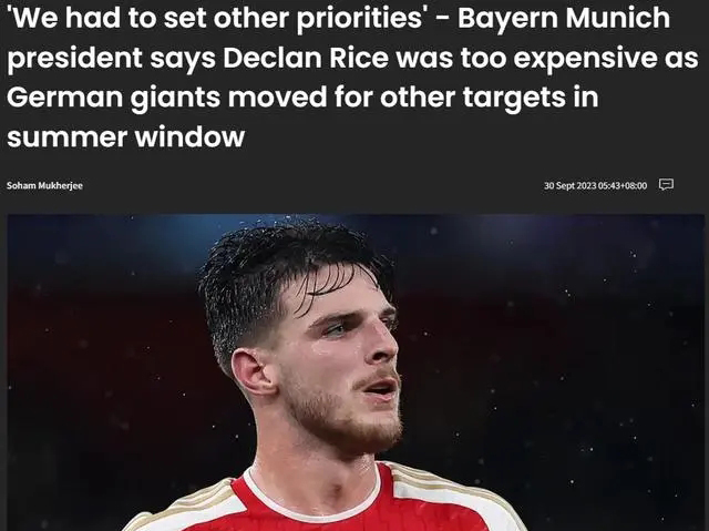 24直播网09月30日讯 拜仁慕尼黑主席赫伯特-雷纳表示,德克兰-赖斯的身价对拜仁来说太高了,因此他们在夏天选择了其他目标。