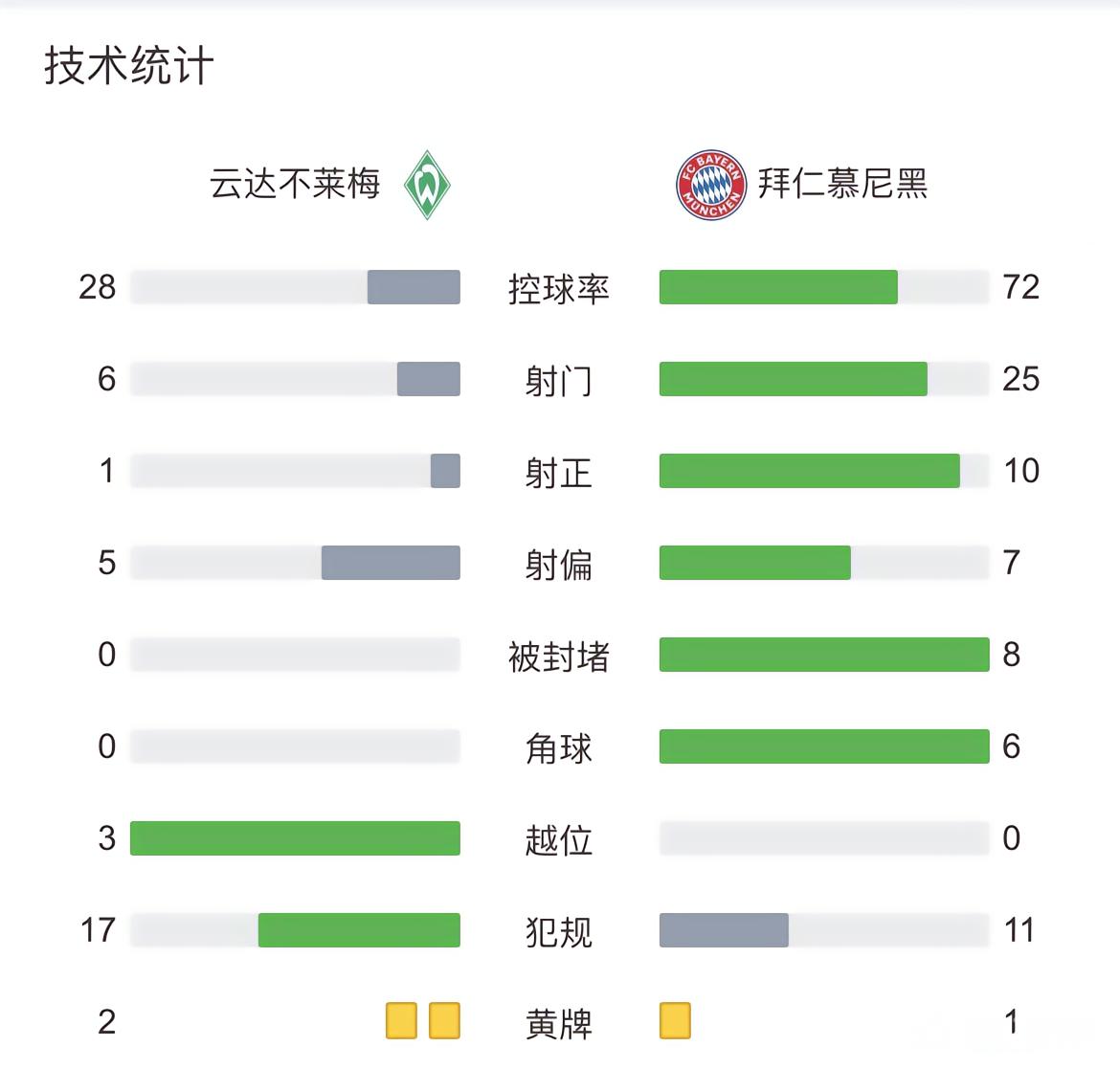 双方出场阵容: 不莱梅首发:1-帕夫连卡、3-安东尼-容(79'35-Opitz)、5-皮珀、13-维利科维奇、32-马尔科-弗里德尔、6-斯特奇(79'9-科夫纳茨基)、8-米切尔-魏泽(59'24-伯克)、10-比当古(68'20-施密德)、7-杜克施、14-吕嫩(68'36-克里斯蒂安-格罗斯)、11-菲尔克鲁格 未出场替补:30-泽特尔、17-恩金马、23-拉普、28-格鲁耶夫 拜仁首发:26-乌尔赖希、40-马兹拉维、3-金玟哉(68'4-德利赫特)、2-于帕梅卡诺、19-阿方索-戴维斯、6-基米希、8-格雷茨卡(79'27-莱默尔)、11-科曼(84'13-舒波-莫廷)、10-萨内、42-穆西亚拉(84'25-穆勒)、9-凯恩(84'39-特尔) 未出场替补:43-许尔斯曼、5-帕瓦尔、38-赫拉芬贝赫、41-克雷齐希