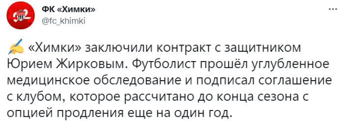 希姆基官方表示,球队与日尔科夫签约至赛季结束,合同中包含1年的续约选项。