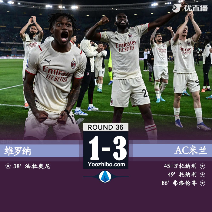 24直播网讯5月9日讯 北京时间5月9日凌晨2点45分,2021-22赛季意甲第36轮在本特戈蒂球场展开角逐,AC米兰客场挑战维罗纳。上半场法拉奥尼先拔头筹,莱奥助攻托纳利扳平,下半场莱奥再次助攻托纳利反超,弗洛伦齐替补锁定胜局。最终AC米兰客场3-1逆转维罗纳,积分榜方面,AC米兰积80分领先国米2分,重回榜首,维罗纳积52分位列第9。