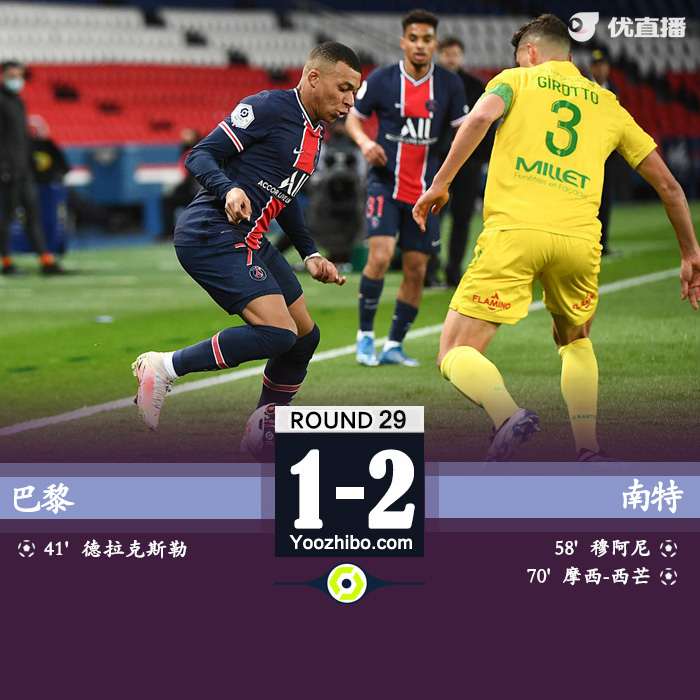 24直播网3月15日讯 北京时间03月15日星期一04:00,法甲第29轮巴黎圣日耳曼主场迎战南特。上半场,德拉克斯勒破门,巴黎半场1-0领先南特。下半场,姆巴佩回传失误送礼,穆阿尼传射,西芒反超比分。最终,巴黎主场爆冷1-2遭南特逆转。