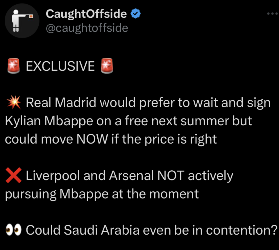 24直播网讯07月12日,来自知名记者Ben Jacobs的最新消息,沙特方面已经加入了对姆巴佩的争夺。沙特公共投资基金(PIF)希望为旗下的4支俱乐部签下姆巴佩1年的时间,即使球员会在1年后加盟皇马。