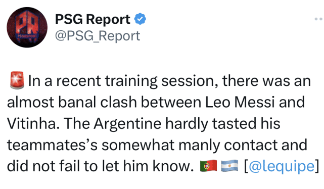 24直播网讯02月24日,法国知名媒体《队报》透露,在巴黎圣日耳曼最近的训练课上,梅西与葡萄牙国脚维蒂尼亚发生了小冲突(clash)。