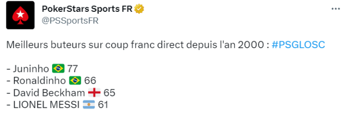 赛后,据PokerStarsSports统计,梅西职业生涯至今已经打进61粒直接任意球,是21世纪任意球进球数第四多的球员。