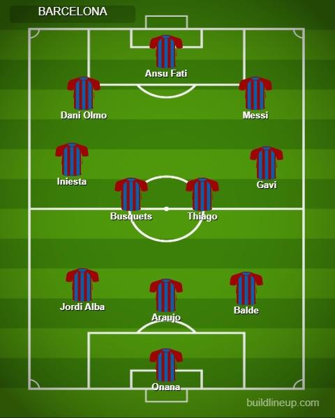中场:伊涅斯塔、布斯克茨、蒂亚戈、加维