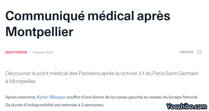 在巴黎3-1战胜蒙彼利埃的比赛中第20分钟伤退,赛后被诊断为左大腿股二头肌损伤。