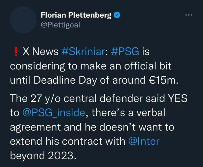 巴黎打算向国米报价1500万欧元,因为什克里尼亚尔已经明确表示不愿意与国米续约,今年6月的合同就将到期。