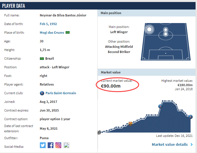 24直播网04月28日讯 《每日体育报》消息,内马尔2017年夏天从巴塞罗那转投巴黎圣日耳曼后,身价从2.22亿欧下降到现在的9000万欧。