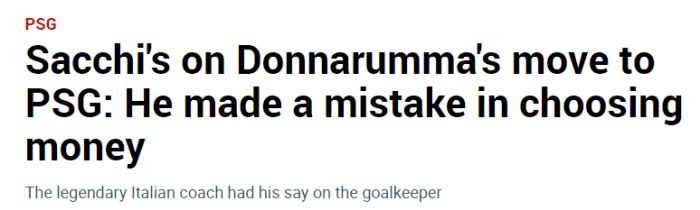 在巴黎遭皇马逆转的比赛中,多纳鲁马要为第一个丢球负责。萨基表示:“他选择钱是错误的。去年夏天我在米兰就告诉了他父母。”