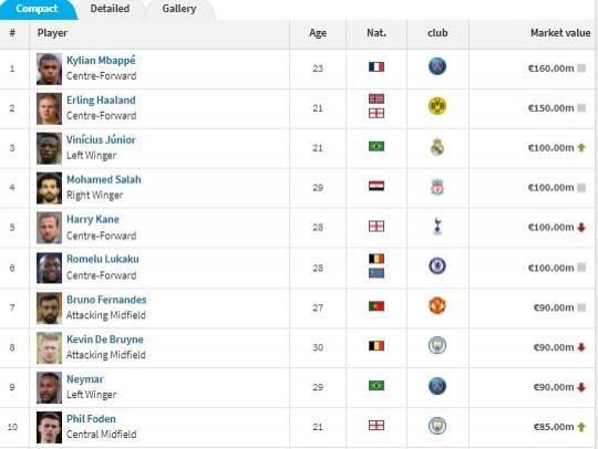 24直播网12月31日讯 德国转会市场日前更新了世界足坛球员身价排行,姆巴佩和哈兰德排名前二,维尼修斯、萨拉赫、凯恩和卢卡库并列第三。