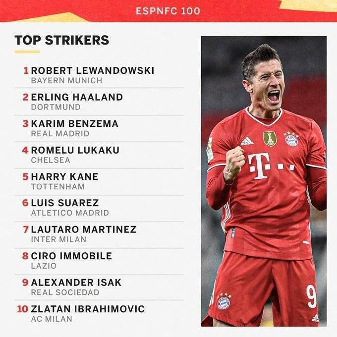 24直播网讯 ESPN今天评选了2021年年度十大前锋,莱万排名第一,哈兰德和本泽马分列二三位。