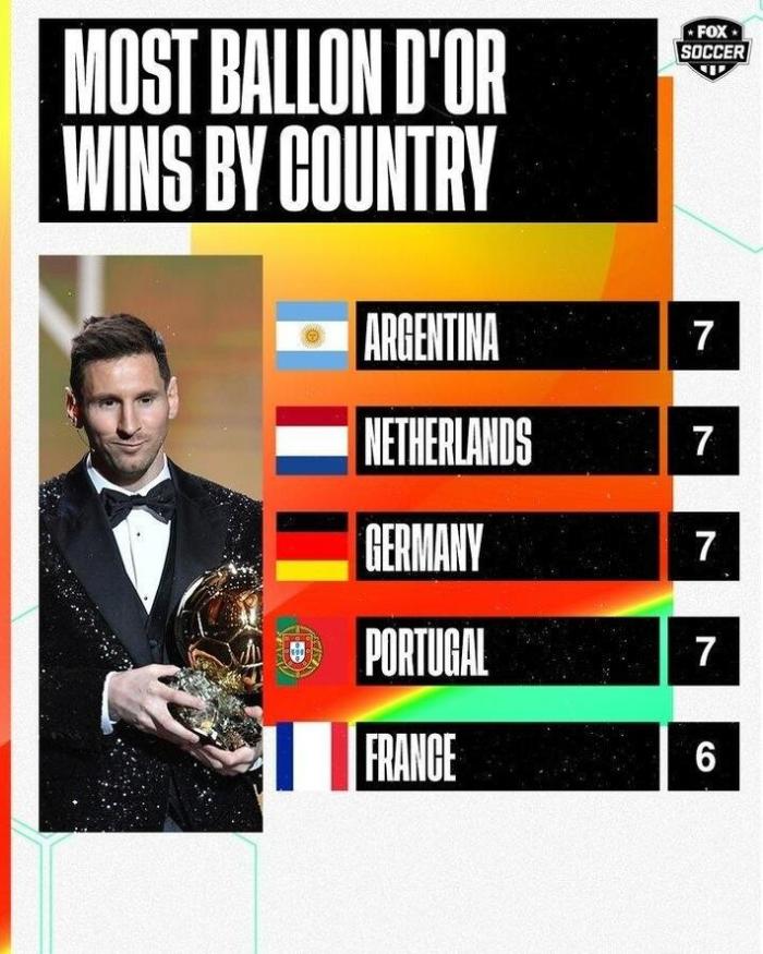 24直播网讯 今天,梅西夺得个人生涯第7座金球奖,现在阿根廷的金球奖数量已经追平德国、荷兰和葡萄牙,并列第一。