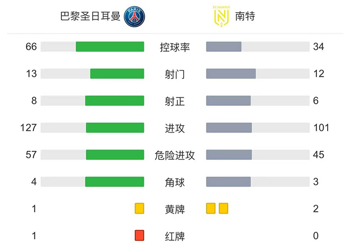 全场比赛结束,巴黎3-1击败南特,继续领跑积分榜。