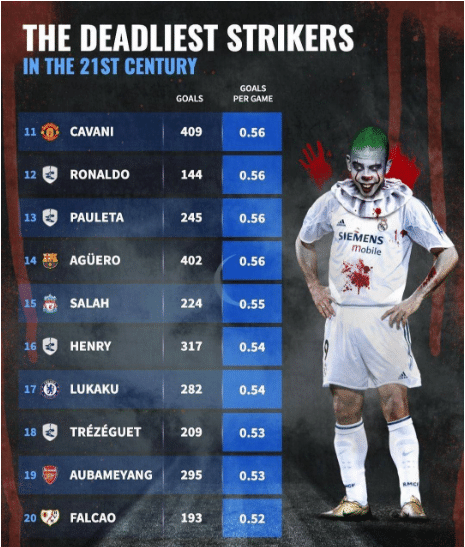 前十之后,第十一的是场均0.56球的卡瓦尼,第十二的是场均0.56球的罗纳尔多,第十三是场均0.56球的保莱塔,第十四是场均0.56球的阿奎罗,第十五是场均0.55球的萨拉赫,第十六是场均0.54球的亨利,第十七是场均0.54球的卢卡库,第十八是场均0.53球的特雷泽盖,第十九是场均0.53球的奥巴梅扬,第二十是场均0.52球的法尔考。