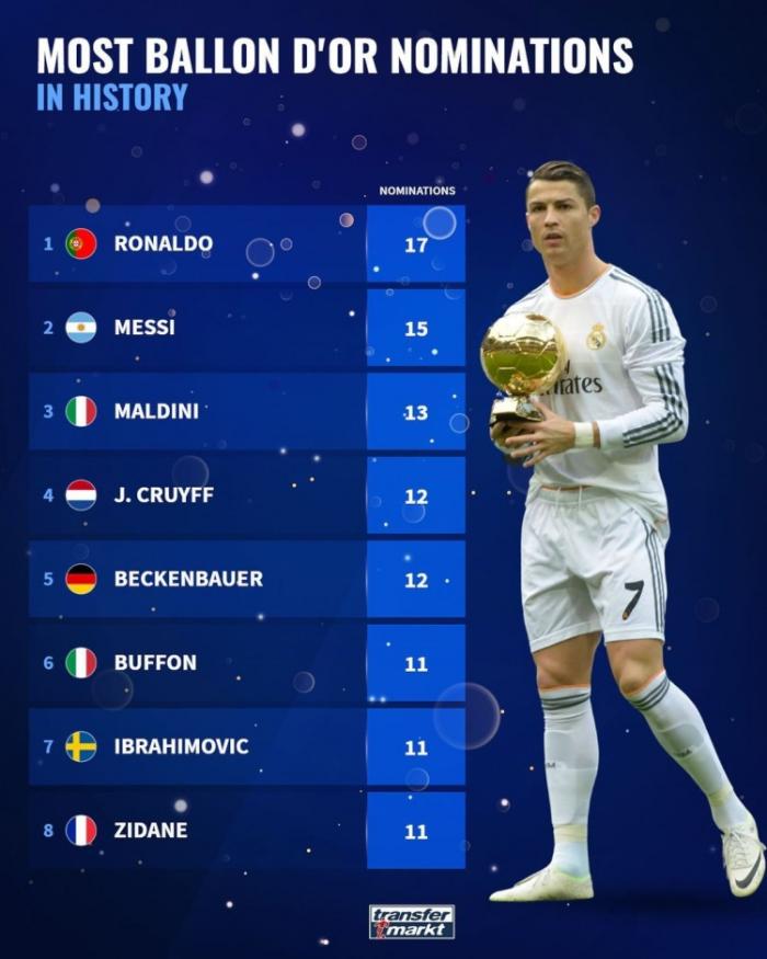 在获得金球奖提名次数方面,C罗17次获得金球奖提名,排名榜首,而梅西夺奖次数虽然更多,但是他只获得了15次提名。第三的是马尔蒂尼,他13次获得金球奖提名,不过可惜的是马队从未斩获过金球奖。第四是克鲁伊夫和贝肯鲍尔,他们都12次获得金球奖提名,第六是布冯、伊布和齐达内,他们都11次获得金球奖提名,不过伊布和布冯从未斩获过金球奖。