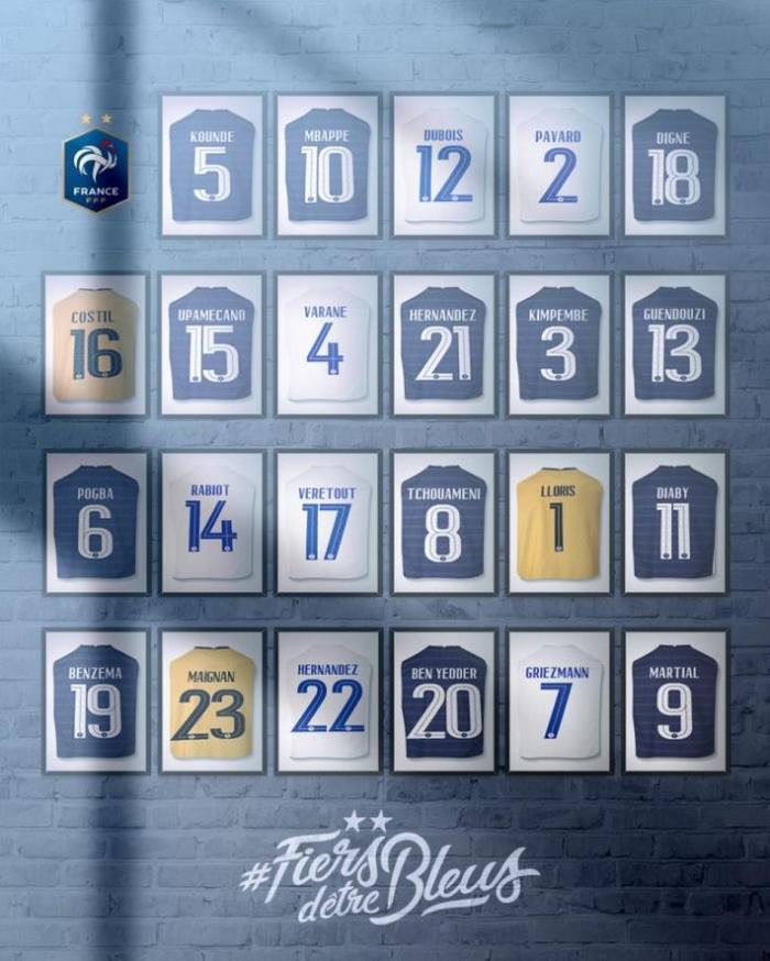 24直播网讯今日法国队公布了集训球员的号码,其中格列兹曼7号,马夏尔9号、姆巴佩10号、本泽马19号。